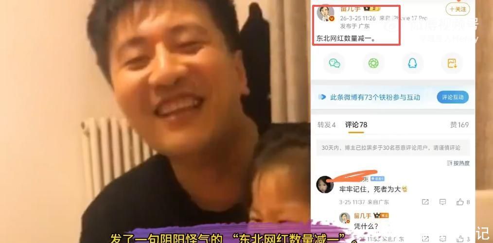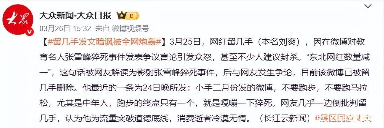 令人震惊的是,仅隔不到24小时,留几手便在微博发布一句轻佻短评:“东北网红少一人”,语义模糊却指向明确,被广泛视为对张雪峰逝世的冷血戏谑,舆论风暴应声而起,瞬间席卷全网。